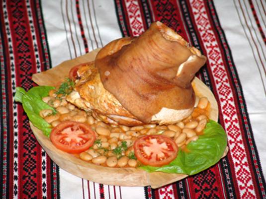 Picioarele de porc se pirlesc pe foc viu, se rad cu lama cutitului, se freaca bine cu malai si se spala in mai multe ape. Rasolul de vaca, picioarele de porc si tacimurile de pasare se pun intrun vas mare cu 10 l de apa.