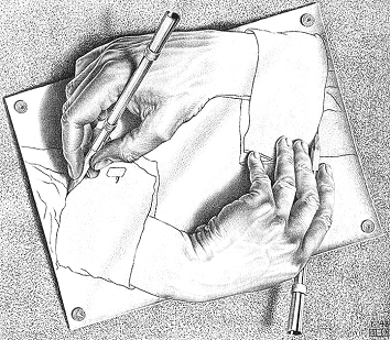 Ca un bonus pentru cei care au avut rabdarea sa citeasca pana la capat acest studiu despre un paradox semantic, prezentam un admirabil desen al lui Maurits Cornelis Escher desen care ne propune