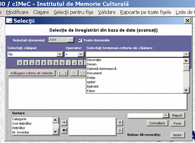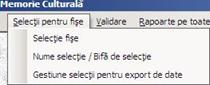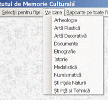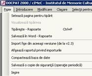 b. Din meniul Rapoarte pe toate fisele se alege domeniul de patrimoniu si in cadrul domeniului selectat se cauta inregistrarea dorita (cu ajutorul cursorului de pozitie din partea de jos a ecranului). Fisa este vizualizata fata la o pozitie, si verso la urmatoarea pozitie). Pentru printare se acceseaza meniul Fisier-> Tipareste - Rapoarte, precizandu-se paginile ce urmeaza sa fie printate. Daca nu sunt specificate, vor fi printate toate fisele de evidenta aferente domeniul cultural respectiv.