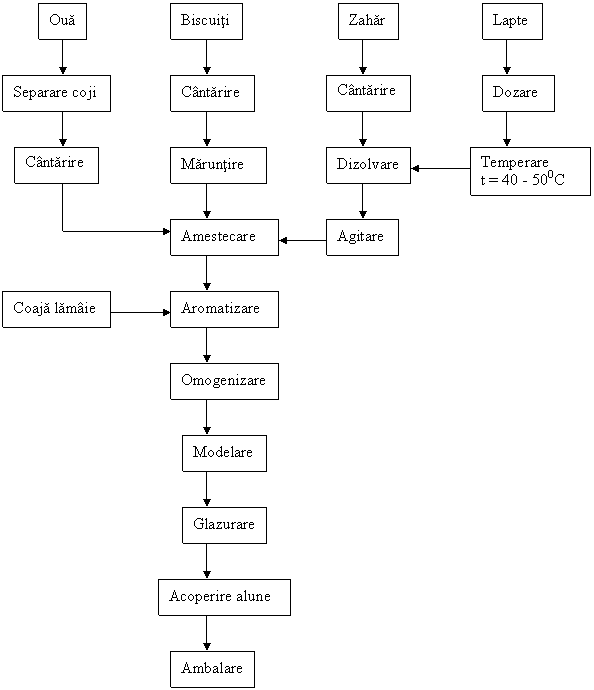Pentru obtinerea acestui produs nou se utilizeaza ca ingrediente principale:biscuiti fin maruntiti ,oua ,zahar,lapte,materii aromatizante.Materiile prime si auxiliare utilizate la fabricarea produsului transmit acestuia valoarea nutritiva (fiind surse de glucide, lipide, proteine, vitamine, enzime), precum si gustul, aroma si aspectul.