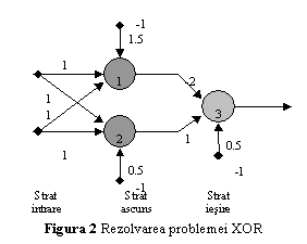 Pentru rezolvarea problemei XOR, va trebui utilizat un alt perceptron, care sa construiasca o combinatie liniara a marginilor de decizie formate de primii doi perceptroni. Acest perceptron va avea ca intrari iesirile celorlati 2, iar o posibila solutie pentru ponderi si valoarea de prag este w31=-2; w32=1; q . Se obtine astfel o retea neuronala cu doua straturi, numita retea conectata inainte (engl: feed-forward network), sau perceptron multistrat (fig. 2).