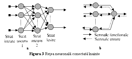 semnale de eroare, care se propaga in sens invers (de la iesire spre intrare) in retea, parcurgand fiecare neuron. Aceste semnale depind de modul de evaluare a erorii dintre valoarea reala a semnalului de iesire din retea si valoarea dorita a acestuia (fig. 3b)