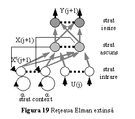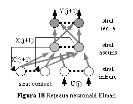 Conform fig. 18, daca la momentul j este aplicat pe intrarea retelei vectorul U(j), aceasta va furniza la iesirea stratului de iesire vectorul Y(j ), iar vectorii de iesire ai stratului ascuns si de context sunt X(j+1) si respectiv Xc(j+1). Functionarea retelei va fi descrisa de ecuatiile