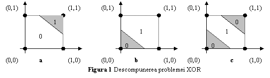 Problema XOR poate fi descompusa in doua probleme liniar separabile, rezolvabile cu ajutorul perceptronului (fig. 1).