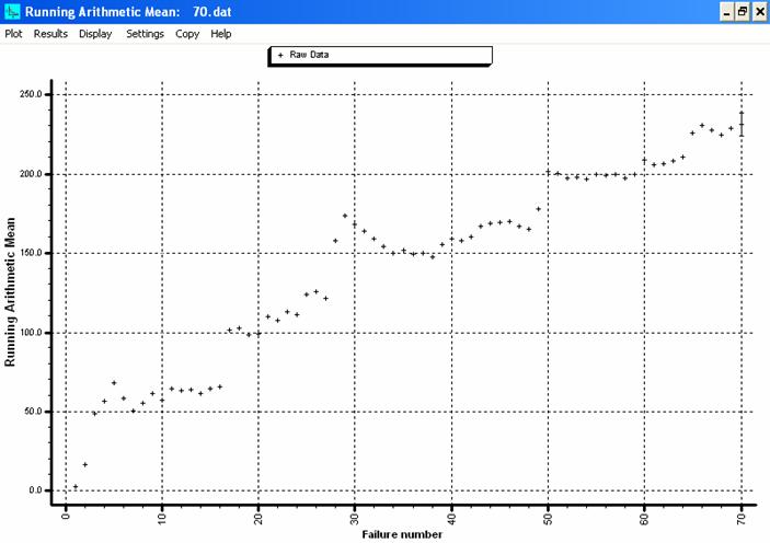 Figura de mai jos (fig.1) reprezinta testul mediei aritmetice a executiilor aplicat setului de date 70.dat si indica o crestere a mediei executiilor ceea ce inseamna o crestere a timpului intre defectari si deci o cerstere a fiabilitatii. Ca urmare modelele pentru predictia fiabilitatii pot fi aplicate cu succes.