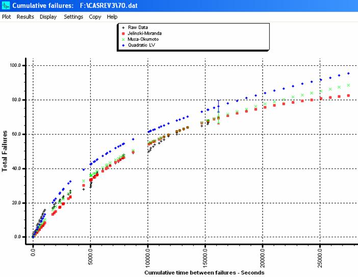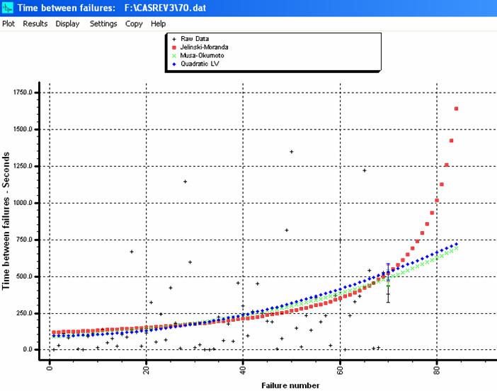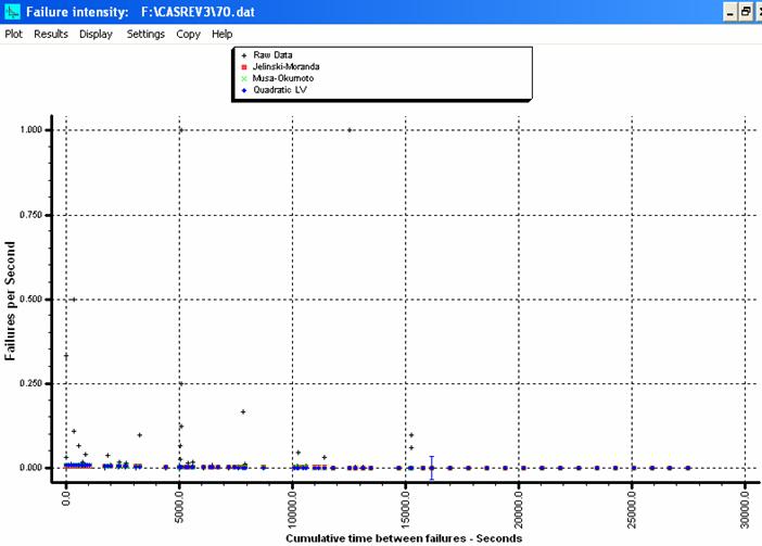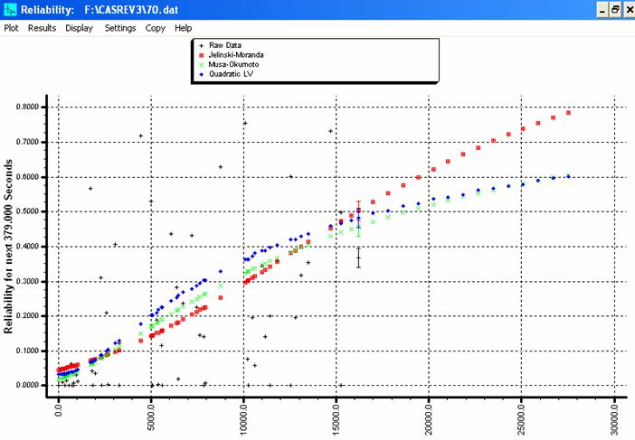 Observand (fig.6) modelul Jerinski-Moranda estimeaza ca dupa 200.000 secunde de functionare probabilitatea de buna functionare a programului pentru inca 1.864 secunde este 1. Conform modelului Musa-Okumoto dupa 200.000 secunde de functionare probabilitatea de buna functionare a programului pentru inca 1.864 secunde este 0,67. Iar dupa modelul qadratic Littlewood-Verall dupa 200.000 secunde de functionare probabilitatea de buna functionare a programului pentru inca 1.864 secunde este 0,54.