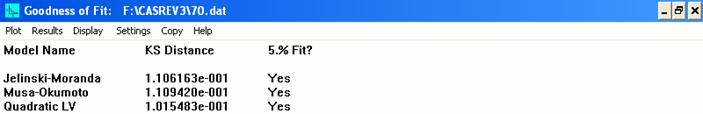 In tabelul de mai jos (fig.7) sunt reprezentate calitatile potrivirii celor trei modele executate asupra setului de date. Acest test se realizeaza in prima faza inaintea aplicarii oricarui alt criteriu de evaluare, scopul testului este de a determina daca rezultatele unui model se incadreaza in nivelul de specificatie specificat. Pentru datele de tip timp intre defectari este folosit testul Komogorov-Smirnov. Pe prima coloana a tabelului avem numele modelului, pe coloana a doua este specificata valoarea calitatii potrivirii (mai exact statistica testului Kormogorov-Smirnov), iar in coloana a treia se indica daca modelul se incadreaza in nivelul de specificatie de 5%. Astfel observam din tabelul de mai jos ca toate rezultatele celor trei modele se incadreaza in nivelul de specificatie de 5% distantele Kolmogorov-Smirnov fiind corecte.