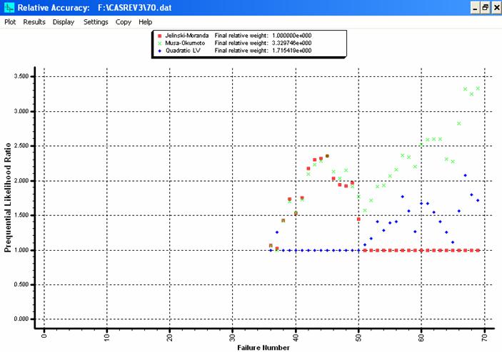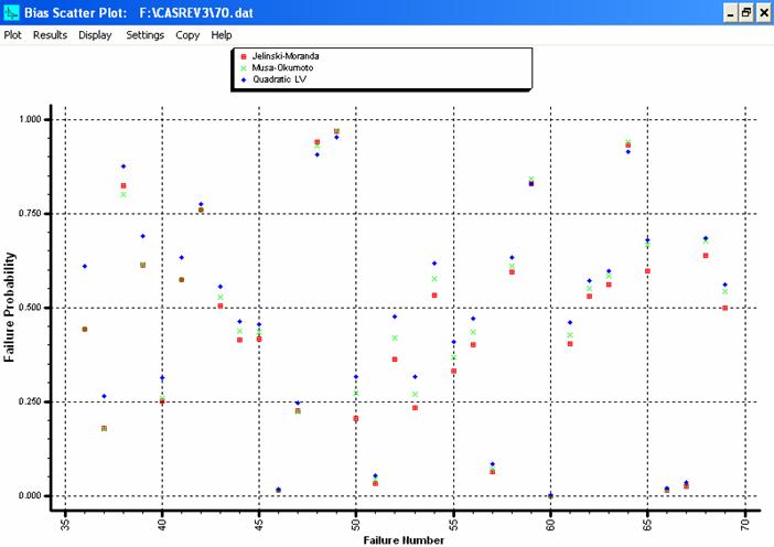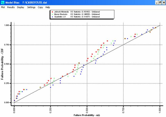 Modelul Musa-Okumoto de-a lungul primului interval de defectare din totalul de 33 de valori ale functiei U ,22 sunt deasupra pragului de 0,5 modelul avand un caracter pesimist iar de-a lungul celui de-al doilea interval de defectare din totalul de 33 de valori ale functiei U ,20 sunt sub pragul de 0,5 modelul avand un caracter usor optimist. In fine modelul qadratic Littlewood-Verall de-a lungul primului interval de defectare din totalul de 34 de valori ale functiei U ,22 sunt deasupra pragului de 0,5 modelul avand un caracter pesimist, iar de-a lungul celui de-al doilea interval de defectare din totalul de 33 de valori ale functiei U ,18 sunt sub pragul de 0,5 modelul avand un caracter usor optimist