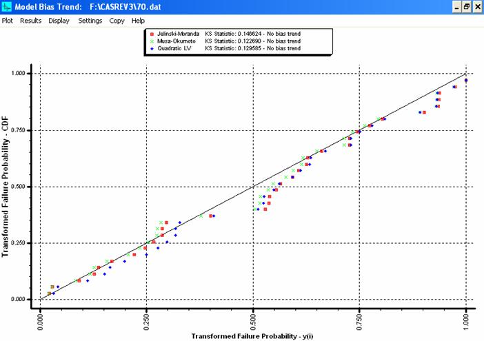 Un alt criteriu de evaluare a modelelor software este graficul U (fig.11) care indica tendinta predictiilor unui model la nivel global fara a tine cont de ordonarea in timp a valorilor distributiilor. In aceasta figura vor aparea distributia cumulativa a functiilor U si distributia cumulativa a probabilitatii reale de defectare, aceasta din urma fiind prima bisectoare. Daca graficul U al unui model este preponderent deasupra primei bisectoare atunci predictia sa pe ansamblul observatiilor este una optimista, iar daca este sub prima bisectoare avem o tendinta pesimista a modelului in cauza. Dupa cum observam din (fig.11) modelul Jelinski-Moranda are tendinta de a face estimatii optimiste in ceea ce priveste timpi intre defectari, in timp ce celelalte doua modele nu au nici un fel de tendinte ele urmarind in deaproape prima bisectoare, aceste presupuneri sunt confirmate si de legenda din partea de sus a figurii, unde ne este indicata valoarea distantei Kormogorov pentru fiecare model si daca ele au o anumita tendinta.