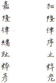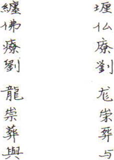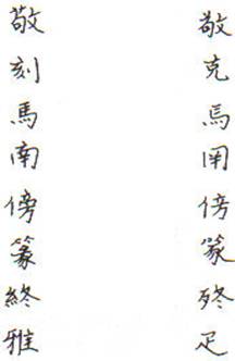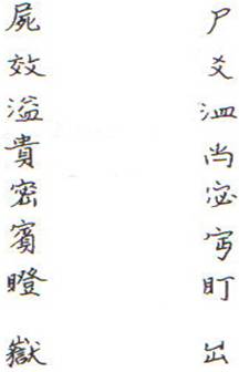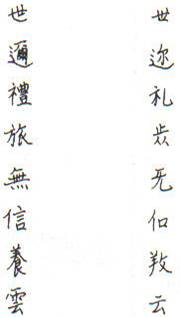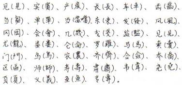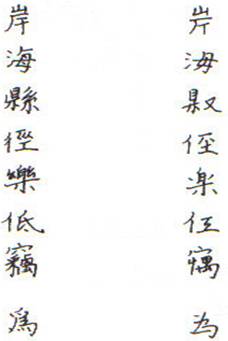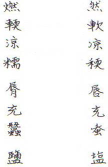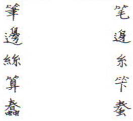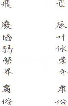 In cele ce urmeaza voi prezenta o serie de caractere simplificate in perioada dinastica, culese din textele vechi sau de pe placile comemorative (selectia ii apartine lui John T.S. Chen, si a fost prezentata in lucrarea sa Reformele scrierii chineze publicata de Institutul de Studii Chineze din cadrul Colegiului Frantei ). Prima forma este cea a caracterului complicat, cea de- a doua este cea a caracterului simplificat, urmate de pronuntie si sens :