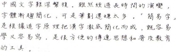 "Scrierea chineza este dificila si complicata. Chiar daca de-a lungul evolutiei sale a fost simplificata, numarul de trasaturi din compozitia caracterelor este inca foarte mare. Semnele jianyi sunt caractere chinezesti simplificate intr-o maniera radicala, conform unor principii etimologice. Fiind usor de invatat si de scris, ele reprezinta un instrument foarte la-indemana pentru transmiterea de idei si pentru propagarea educatiei."[57]