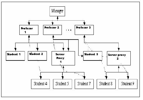 Din figura 3.2 se poate observa ca cel ce se afla in varful infrastructurii este managerul, care detine informatiile topologice dinamice ale salilor de clasa, informatii ca inregistrarea studentilor la cursuri, datele referitoare la autentificarea studentilor si profesorilor, adresele IP si porturile folosite(listen port) de catre agentii de tip profesor dar si adresele IP ale serverelor proxy la 'distanta'. Cu ajutorul acestor informatii, profesorul si studentii sunt capabili sa creeze o sala de clasa flexibila dupa cum urmeaza: