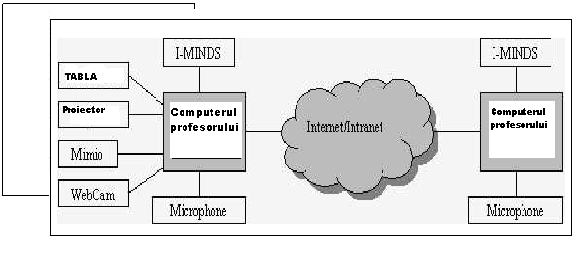 echipamente hardware necesare minime. Dispozitivele necesare profesorului include doar un sistem de calcul de performanta superioara si un microfon. Pentru a se obtine un impact cat mai bun, profesorul poate folosi un dispozitiv Mimio, un mouse Mimio, un proiector LCD si un dispozitiv webcam. Pe partea de student, se poate folosi un sistem de calcul echipat standard cu microfon, boxe, sistem ce poate oferi astfel toate functionalitatile si echiparile necesare pentru a se obtine acces complet la resursele I-MINDS. Datorita cerintelor minime pentru latimea de banda a retelei, nu sunt necesare retele dedicate, astfel incat atat studentii cat si profesorii pot folosi reteaua Internet.