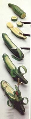 5 - 6 cm si indepartarea a unei cantitati mici de mijloc. Un castravete de marime medie se taie cu ajutorul cutitului de curatat legume nu pana la capat, coaja se roteste in forma de frunzulite. Mai putem taia rondele, feliute s.a.