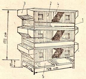 Cusca pe trei niveluri cu tava pentru colectarea dejectiilor: 1. cadrul bateriei de custi; 2. usa de acces in cusca; 3. jgheab pentru fibroase; 4. hranitor; 5. tava pentru colectarea dejectiilor.