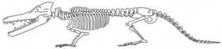 - Cetacea (Eocen - Q) - cuprind delfinii si balenele, mamiferele cel mai bine adaptate la viata in mediul acvatic (pelagic). Corpul fusiform terminat printr-o inotatoare codala bilobata, dispusa orizontal. Craniul cu portiunea preorbitala foarte alungita, oasele maxilare formand un rostrum ascutit; membrele anterioare sunt transformate in palete inotatoare (au 5 degete cu falange numeroase - hiperfalangie); membrele posterioare lipsesc. Pakicetidele (Fig. 45) - au fost primele ceteacee, mult mai primitive decat balenele. De fapt ele nu semanau de loc cu balenele si nu traiau in mare. Resturile fosile au fost gasite numai in Pakistan si NW Indiei, in Eocenul mediu. Ambulocetidele (Eocen) (Fig. 46) - prezentau forme ceva mai bine adaptate la viata in mediul acvatic si propbabil ocupau nise ecologice similare cu cele ale crocodilienilor actuali.