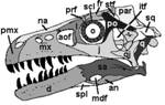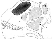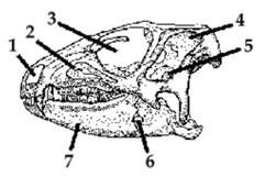 Figura 30. Craniul unui archosaur: 1-Narine; 2-Fereastra antorbitala; 3-Orbita; 4- Ferestra temporala superioara; 5-Fereastra temporala inferioara; 6-Fereastra mandibulara; 7-Mandibula. |