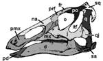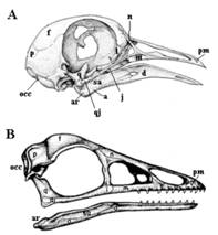 Figura 36. Comparatie intre craniul genurilor Columba (Q) si Archaeopterix (J3). |