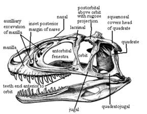 Archosauria reprezinta un grup major de reptile diapside, diferentiate de alte diapside, prin prezenta unei singure deschideri (in fiecare parte a craniului), dispusa in fata orbitei - fereastra antorbitala plus alte caracteristici (Fig. 30). Se continua tendinta tetrapodelor, de reducere a oaselor craniului prin fuzionarea unui numar mare de oase si prin deschiderea ferestrelor in craniu. Acest fapt conduce la usurarea craniului, exista mai mult spatiu pentru muschi si alte tesuturi si confera craniului o flexibitate sporita (kinesis) atunci cand animalul se hraneste. O alta trasatura tipica archosaurienilor este data de existenta unei alte deschideri, in mandibula -fereastra mandibulara. Alte caracteristici importante: craniul este mai inalt si mai ingust, cu botul pronuntat, dintii sunt implantati in alveole (de tip thecodont), iar oasele din alcatuirea gleznei sunt modificate; prezinta tub calcaneal = calcai = suprafata de atasare pentru unii din muschii flexori, inferiori ai piciorului.