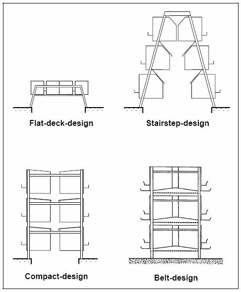 In sistemul cu custi se disting patru mari tipuri de baterii: sistemul pe podea, sistemul in scari, sistemul compact si sistemul centura. In plus, sunt valabile sistemele "fully stepped" .