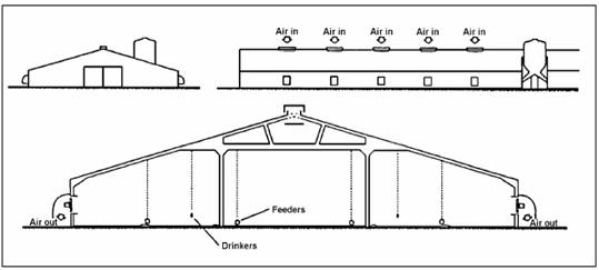 Halele traditionale pentru cresterea intensiva de pasari pentru carne sunt constructii simple, inchise, din beton sau lemn, cu lumina naturala sau fara ferestre si cu sistem de iluminat, izolate termic si ventilate fortat. Cladirile mai pot fi construite si fara pereti laterali ( cu perdele de jaluzele); ventilatia fortata ( pe principiul presiunii negative) este pe principiul clapetelor si al valvelor de admisie de aer. Halele deschise trebuie asezate in asa fel incat sa fie expuse la curentii naturali de aer si in unghi drept fata de directia predominanta a vantului.[3]