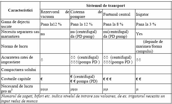 Compararea calitativa a caracteristicilor pentru patru sisteme de transport a namolului