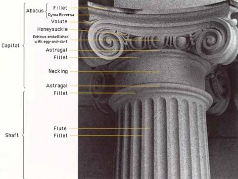 Elementul care da particularitate templului este coloana. In interiorul edificiului, ea sustinea grinzile acoperisului , iar in exterior forma galeriile acoperite (porticul ). Proportiile si dimensiunile coloanei determina stilul arhitectonic al templului. Coloana este compusa din 3 parti : baza , corp (fus) si partea superioara (capitel). Pentru evitarea monotoniei coloana prezinta caneluri , in timp ce, prin forma, capitelul diferentiaza stilurile artei grecesti : doric, ionic si corintic (anexa 1)