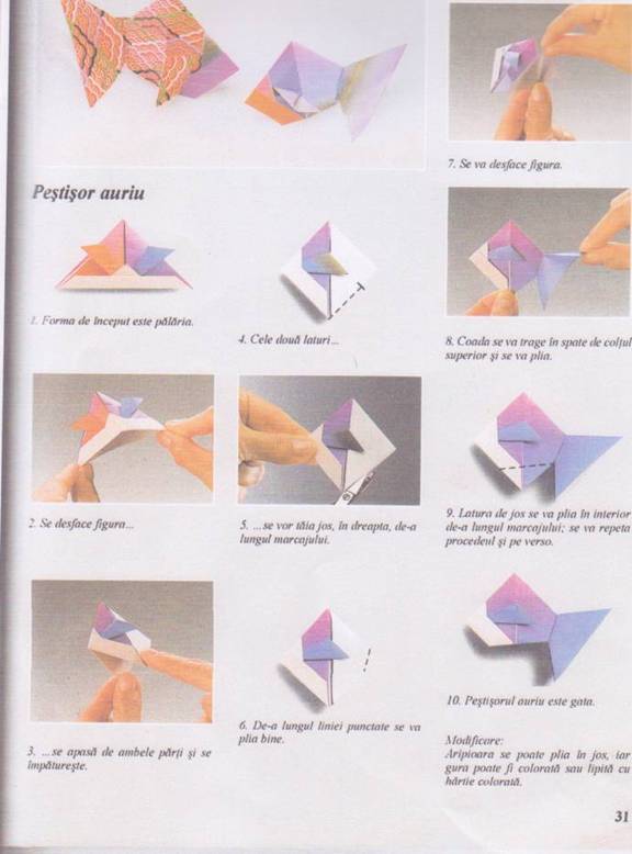 Tehnica origamii este o arta straveche de pliere a hartiei.Ea are la mai multe FORME DE BAZA,de la care se pleaca pentru a realiza modelele preferate.Forma de baza III,este punctul de plecare in realizarea PALARIEI,iar ind forma de PALARIE se realizeaza ,prin indoituri diferite PESTISORUL AURIU.