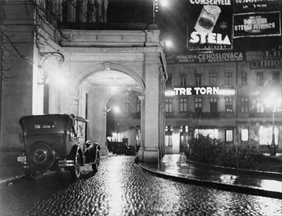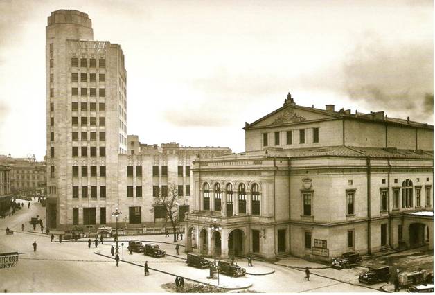 Intr-o fotografie a anilor 30 vedem arcadele Teatrului National si fatada Casei Fialkowsky seara ; deja reclamele cu neon incep sa inlocuiasca pe cele clasice :
