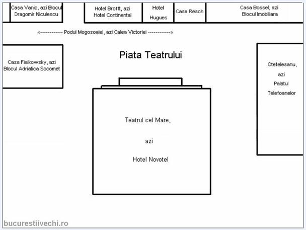 In configuratia de azi, Piata Teatrului era cuprinsa intre Novotel (al carui portic de intrare aminteste in mod fericit de intrarea vechiului Teatru), blocul cu turn si ceas din coltul Str Campineanu cu Calea Victoriei, Hotelul Continental impreuna cu cladirile alaturate si Palatul Telefoanelor.