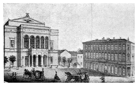 In acelasi an Adunarea Obsteasca propune construirea pe bani publici a teatrului, iar domnitorul Alexandru Dimitrie Ghica aproba initiativa. Noua locatie aleasa este Hanul Filaret situat tot pe Podul Mogosaoiei, ce apartinuse Mitropoliei, iar apoi devenise pe timpul ciumei lui Caragea [1813] spital pentru ciumati. Hanul se gasea aproximativ pe spatiul ocupat azi de Novotel. Distrus de cutremurul din 1838, hanul a fost demolat in 1846 si a inceput constructia teatrului in stilul barocului tarziu dupa proiectul arhitectului vienez Anton Hefft.