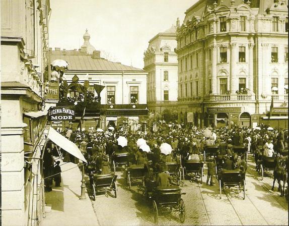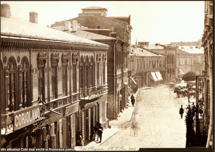 O fotografie facuta in 1880 dinspre sud, infatiseaza masiva Casa Fialkowsky si Teatrul National :