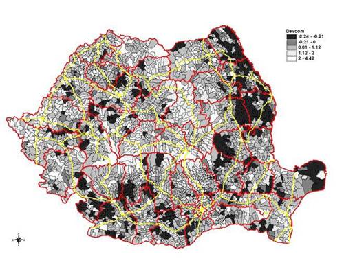 Reprezentarea cartografica a saraciei la nivel de comuna evidentiaza faptul ca, exceptand Moldova estica, marcata de saracie compacta la nivel de judet, in restul tarii saracia rurala se manifesta pe arii subjudetene (Figura). Comunele sarace din insulele de saracie se afla situate, majoritar, la marginea judetelor, departe de marile axe de circulatie rutiera. Constatarea este in linie cu ideea geografilor care sustin ca drumul face viata sociala. Drumurile de rang european trec de obicei prin centrele judetene iar acestea, la randul lor se afla situate, preponderent, in centrul judetului. In consecinta, satele de la margine de judet ajung frecvent sa fie departe si de drumurile modernizate si de marile orase.
