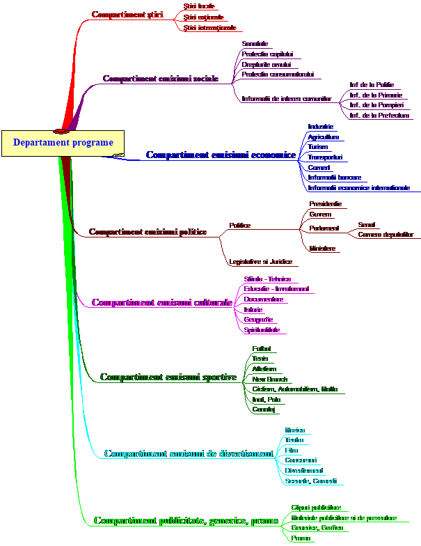 Departamentul de programe – concepe, organizeaza si pune în aplicare realizarea unor emisiuni si programe. De asemenea participa la realizarea unor materiale comandate de catre clienti (clipuri publicitare, filme de prezentare si promovare de produse, etc.). Este compus în general din reporteri redactori si realizatori de emisiuni. Nu pot lipsi nici “oamenii cu idei” care sunt cheia succesului la realizarea de clipuri, emisiuni de promovare, reclame. Acest departament poate fi subdivizat dupa tipurile de emisiuni realizate dupa cum se vede în diagrama numarul 1.