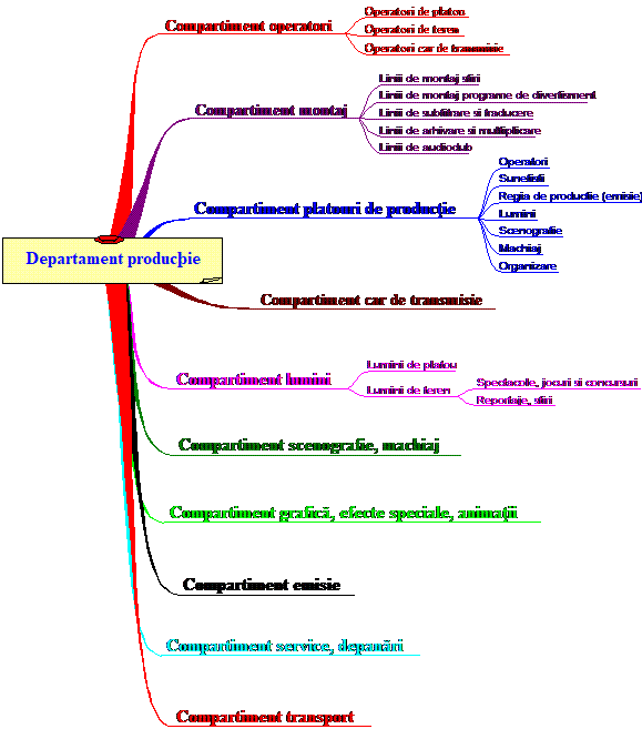 Departamentul de productie – realizeaza practic programele, emisiunile si materialele cerute de catre departamentul programe. Personalul implicat are bune cunostinte tehnice si cunoaste modul de utilizare al echipamentului din dotare. Realizarea programelor se face în strânsa legatura cu personalul de la departamentul de programe. Este compus în general din operatori, monteuri, regizori de productie sau emisie, sunetisti, personalul de la lumini, scenografi, personal de service si întretinere. Acest departament poate fi subdivizat dupa cum se vede în diagrama numarul 2.