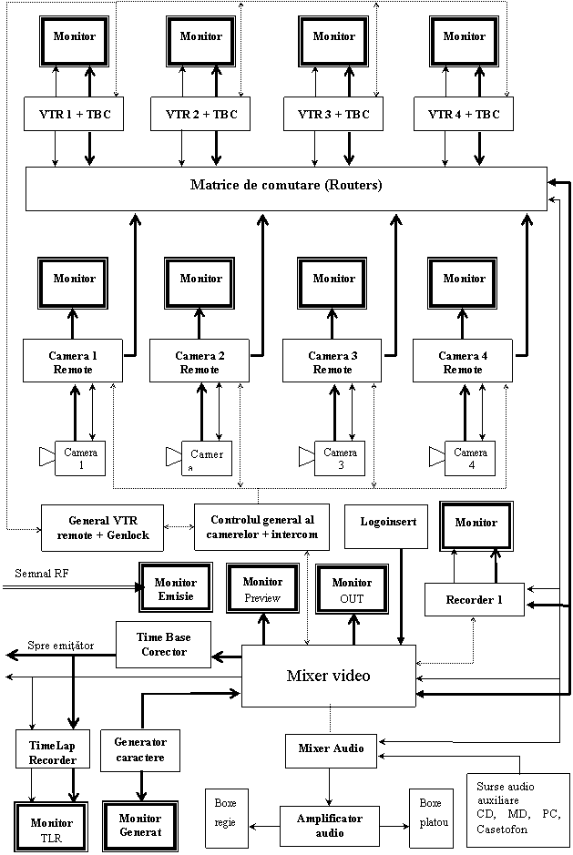v Sistemul de alimentare – specific activitatii de televiziune este faptul ca emisia trebuie sa mearga indiferent de ceea ce se întâmpla în jur. De aceea trebuie prevenita una din cele mai frecvente probleme ce poate apare si care poate întrerupe emisia: lipsa tensiunii de alimentare. De aceea este bine sa existe surse independente de sistemul national de alimentare cu energie electrica. Pot exista mai multe solutii, una dintre ele se bazeaza pe un sistem de acumulatori (12V 50-100A/h) care sa permita o alimentare a regiei de emisie pe perioade relativ scurte (30-120 minute). Pentru perioade mai mari se poate folosi un grup electrogen (un generator actionat de un motor cu combustibil, benzina, motorina, etc.) de mai mare putere ce poate alimenta întreg studioul. Este necesar sa existe un sistem automat de detectie a întreruperii tensiunii de la retea si trecerea pe sursa secundara.