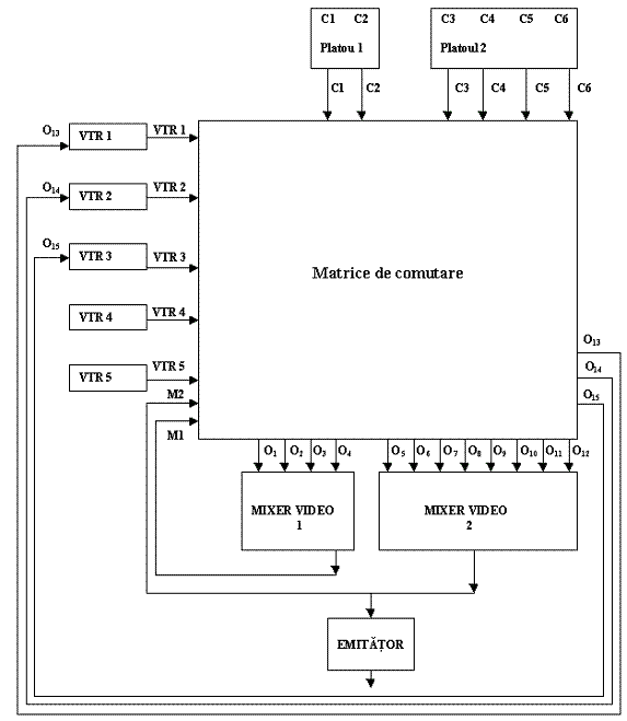 Cu ajutorul sistemelor de comutare poate fi introduse în emisie imagini provenite de la diferite surse de semnal (din studio sau din exterior). Matricele de rutare si comutare pot fi analogice sau digitale, întelegând prin acesta semnale vehiculate sau prelucrate în aceste unitati sunt fie analogice fie digitale. În cazul prelucrarilor digitale, semnalele ce pot fi de tip serie sau paralele. Pentru semnalele video de exemplu, la o transmisie seriala se obtine o rata de 9 27 Mb/s=243 Mb/s, iar în cazul transmisiei paralele multiplexate o rata de 27 Mb/s (13.5 Mb/s Y + 6.75 Mb/s R-Y + 6.75 Mb/s B-Y) sau paralele pe 3x8 biti la 13.5 Mb/s. În matricele de comutare se recomanda folosirea codului serie, întru-cât exista o singura cale de semnal pentru o sursa de semnal video digital, în timp ce utilizarea codului paralel necesita 9 cai de semnal (8 biti video +1 bit semnal de tact). În matricele video se foloseste codul paralel care permite procesarea în timp real a semnalelor video digitale. Trecerea de la o forma la alta de semnal se face cu ajutorul interfetelor serie-paralel respectiv paralel-serie.