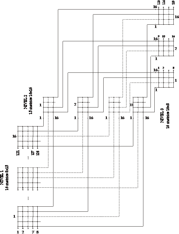 În figura 7.3 este prezentata structura matricei 128 x 128, realizata pe trei nivele. Traseul îngrosat de pe schema indica un traseu posibil care face legatura între intrarea 7 si iesirea 16.