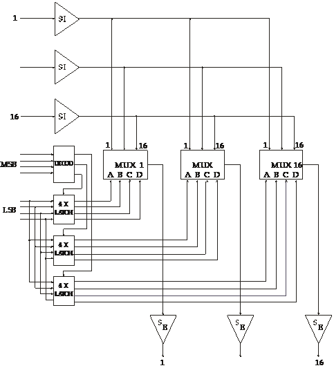 În figura 7.4. se da un exemplu de realizare a unei matrice 16 x 16, separatoare de intrare (SI) si separatoare de iesire (SE). SI are rolul de a realiza adaptarea de impedanta, axarea si întârzierea reglabila a semnalului video, pentru a egaliza diferentele de lungime a cablurilor dintre sursele de semnal si matrice. Separatoarele de iesire au rolul de a realiza o adaptare de impedanta si o egalizare a caracteristicilor de frecventa intrare-iesire. Semnalul de intrare sânt selectate catre iesiri prin intermediul comenzilor în cod aplicate la intrarile A,B,C,D.