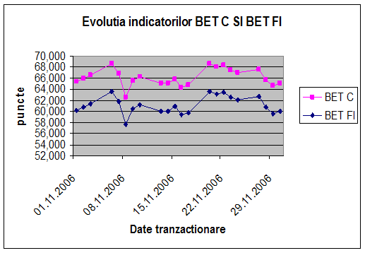 Evolutia indicilor, BET-C (ROL) si BET-FI( ROL ) in perioada 01-30.11.2006 este redata in graficul urmator