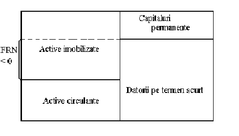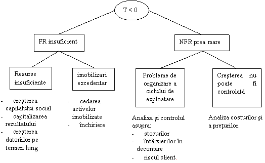 CAZUL 2: T < 0 <=> FRN < NFR; daca trezoreria este negativa, rezulta ca NFR nu poate fi finantat in intregime din resursele pe termen lung si mijlociu si intreprindere este tributara resurselor de trezorerie (in special de origine bancara) pentru a asigura o parte din NFR-ul solicitat de catre ciclul de exploatare. Situatia este alarmanta din punctul de vedere al echilibrului financiar. Intr-adevar, daca derularea normala a ciclului de exploatare permite justificarea reducerii resurselor de trezorerie (in special a celor pe termen scurt la banci), solvabilitatea intreprinderii nu trebuie sa fie sub semnul intrebarii datorita trezoreriei negative. Problema adevarata in acesta situatie este cea legata de dependenta intreprinderii fata de banci ca furnizor al celei maii mari parti din resursele sale de trezorerie.