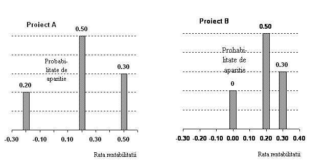 Masura traditionala a riscului aplicabila proiectelor individuale este legata de variabilitatea rezultatelor si este definita prin distributia de probabilitate, asa cum se prezinta in Figura v-1. Aceasta reprezinta distributia de probabilitate a rentabilitatii a doua proiecte A si B. Aceste rentabilitati sunt calculate pe baza fluxurilor de numerar prevazute in cazul unor scenarii alternative. O anumita rata de rentabilitate poate fi interpretata ca rata interna de rentabilitate a proiectului, pe baza fluxurilor de numerar asociate. Cu cat distributia de probabilitate a ratelor de rentabilitate prevazute este mai ingusta, cu atat este mai probabil ca rentabilitatea reala sa fie mai apropiata de rentabilitatea asteptata si cu atat este mai mic riscul proiectului. Ca urmare, proiectul B este mai putin riscant decat proiectul A; fiecare dintre rentabilitatile posibile ale proiectului B este mai apropiata de rentabilitatea estimata decat rentabilitatile posibile ale proiectului A.
