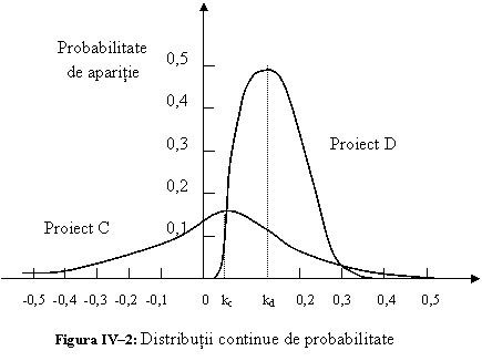 Astfel, deviatia standard este o probabilitate - media ponderata a deviatiei de la valoarea asteptata; ea ne arata cu cat este valoarea reala mai mare sau mai mica decat valoarea asteptata. Daca presupunem, mai departe, ca distributia de probabilitate este continua, astfel ca probabilitatea poate fi estimata pentru fiecare rezultat posibil, atunci putem trasa o curba continua care uneste toate ratele rentabilitatii. Distributiile de rentabilitate pentru doua proiecte, C si D, prezentate in figura de mai jos, sunt exemple de distributii continue de probabilitate. Graficul proiectului C prezinta doua caracteristici ale unei investitii mai favorabile: (1) are rentabilitatea asteptata mai mare si (2) distributia de probabilitate este mai stransa, indicand o dispersie mai mica si, in consecinta, un risc mai mic.