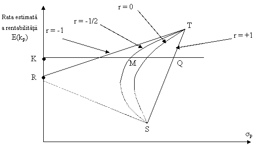 Rata estimata a rentabilitatii portofoliului, E(kp), este reprezentata pe axa verticala, iar deviatia standard a rentabilitatii portofoliului este reprezentata pe axa orizontala. Portofoliul este construit prin utilizarea unei parti a fondurilor disponibile pentru proiectul de investitii S, iar cealalta parte a fondurilor pentru proiectul de investitii T. Modificand ponderea alocata fiecareia din cele doua proiecte, se obtin diferite portofolii. Cand r = +1, relatia dintre S si T este liniara. Pe masura ce coeficientul de corelatie se indeparteaza de 1, linia care uneste S si T se curbeaza tot mai mult. La extrema, pentru r = -1, exista un set de ponderi pentru cele doua investitii S si T pentru care riscul dispare in intregime. Aceasta situatie este reprezentata de punctul R din figura. Pentru a demonstra importanta diversificarii, sa consideram rentabilitatea estimata a portofoliului, notata K. Daca r = 1, punctul risc-rentabilitate este Q. Pe masura ce coeficientul de corelatie se indeparteaza de +1, se obtine aceeasi rentabilitate estimata a portofoliului, deoarece ponderile nu se schimba, dar riscul total al portofoliului este redus. In figura de mai sus, masura diversificarii este diferenta dintre punctul Q si deviatia standard a portofoliului de-a lungul liniei KQ, pentru un coeficient de corelatie dat. De exemplu, efectul diversificarii, pentru coeficientul de corelatie r = -1/2, este egal cu MQ.