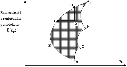 Setul ipotetic al tuturor portofoliilor posibile - numit set realizabil - este reprezentat de suprafata hasurata din figura. Vom defini acum un portofoliu eficient ca acel portofoliu care ofera rentabilitatea maxima posibila pentru orice grad de risc sau gradul de risc minim posibil pentru orice rentabilitate estimata. In figura de mai sus, frontiera BCDE defineste setul de portofolii eficiente. Portofoliile aflate la stanga setului eficient nu sunt posibile, deoarece sunt in afara setului realizabil, adica nu exista nici un set de valori ale ratei de rentabilitate pentru care sa ofere portofoliului o rata estimata a rentabilitatii si un risc, care sa fie reprezentate printr-un punct aflat la stanga curbei BCDE. Portofoliile aflate la dreapta setului eficient sunt ineficiente, deoarece un alt portofoliu ar putea oferi fie o rentabilitate mai mare cu acelasi grad de risc, fie un risc mai mic pentru aceeasi rata a rentabilitatii. Pentru a ilustra aceasta situatie, sa consideram portofoliul (punctul) X. Portofoliul C ofera aceeasi rata a rentabilitatii ca si portofoliul X, dar C este mai putin riscant. In acelasi timp, portofoliul D este la fel de riscant ca si portofoliul X, dar D ofera o rata mai mare a rentabilitatii. Se spune ca punctele C si D (si alte puncte pe frontiera setului eficient dintre C si D) domina punctul X[1].