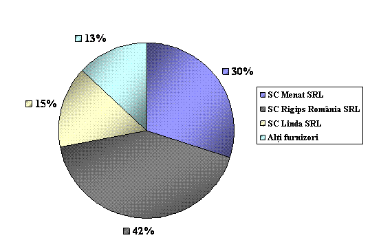 Se remarca faptul ca ponderea cea mai mare in total furnizori o are SC Rigips Romania SRL urmata de SC Menat SRL, care furnizeaza cea mai mare cantitate de marfa necesara intreprinderii pentru a-si desfasura activitatea comerciala, acest lucru fiind datorat in principal calitatii si preturilor asigurate pentru SC Sakita Impex SRL.