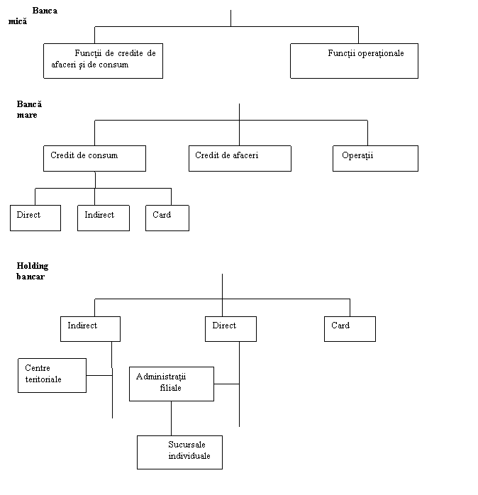 In figura nr. 10 sunt prezentate schematic structurile organizationale ale functiei creditului de consum, in cazul tipurilor semnificative de banci: mici, mari, holding.