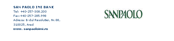 SANPAOLO IMI BANK ROMANIA este entitatea care reprezinta GRUPUL SANPAOLO IMI in Romania, ea fiind rezultat al politicii de internationalizare a Grupului, expresie a interesului acestuia fata de procesul de dezvoltare al tarilor din Europa de Est.