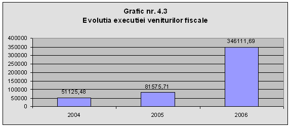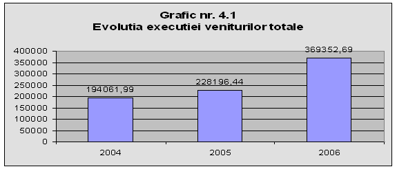 Din graficul realizat, se observa ca evolutia anuala a executiei veniturilor publice locale este una crescatoare, acestea crescand in anul 2006 cu 53% fata de anul 200 Acest lucru nu poate sa insemne decat ca mijloacele banesti pe care administratia publica le are la dispozitie s-au marit deoarece si volumul veniturilor, impozitelor si taxelor ce formeaza veniturile totale ale primariei au crescut si ele.