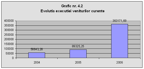 Se poate observa ca veniturile curente au crescut in anul 2006 in cea mai mare proportie, cu aproximativ 312000 lei. Evolutia anuala a executiei bugetare a veniturilor curente ale bugetului local pastreaza, in linii mari, evolutia anuala a executiei veniturilor totale, datorita faptului ca veniturile curente reprezinta cea mai mare parte (peste 90%) din veniturile totale. De remarcat este ca se mentine acelasi an de varf de incasari (anul 2006), precum si anul cu incasarile minime (anul 2004).